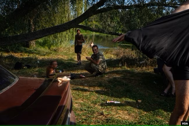 河邊灌木叢中的一塊空地附近,約有十幾名烏軍士兵在岸邊休息,他們脫了外套——只穿著緊身泳褲、迷彩褲和內衣。我們距離俄軍大約五公里。
