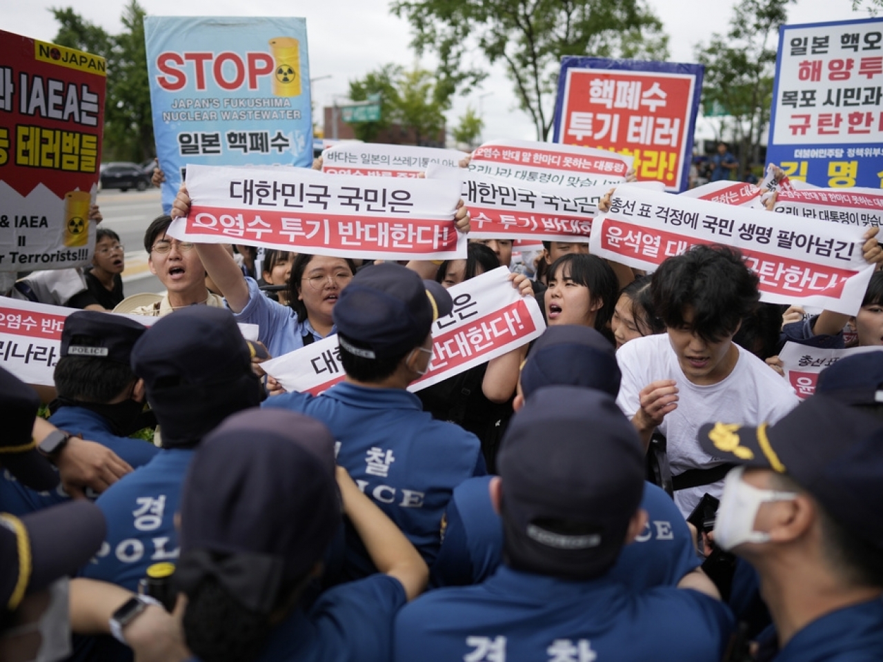 韓聯社報道,示威者下午手持「海洋不是日本垃圾桶」、「反對排放核污水」的標語,又叫口號,試圖闖入大使館,警方以非法闖入和違反集會示威法,拘留16名大學生,其他人被驅散。警方事後限制進入使館所在的建築物。