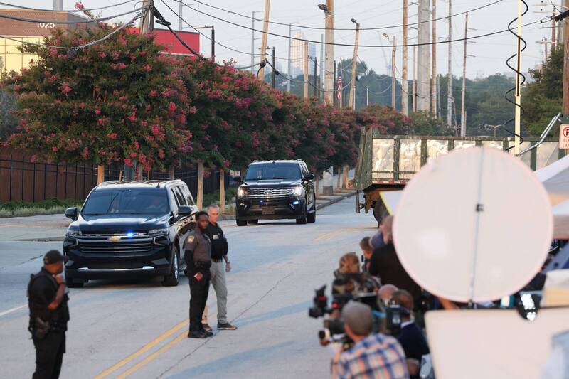 川普在美東時間24日晚間7時3分抵達亞特蘭大的哈特斐德-傑克森機場,並由其車隊載往富爾頓郡監獄報到。(路透)