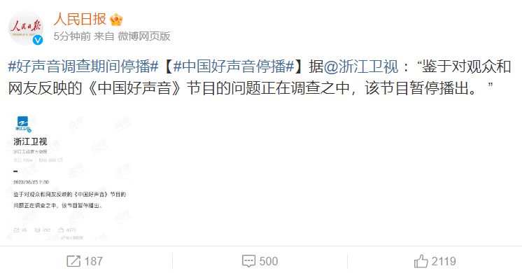 浙江衛視官方微博(25日)發出簡短聲明指出:「鑒於對觀眾和網友反映的《中國好聲音》節目的問題正在調查之中,該節目暫停播出。」《人民日報》亦有轉發有關報道。