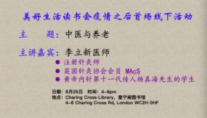 中华时报/中华新闻通讯社:美好生活读书俱乐部于2023年8月25日,在伦敦查宁阁图书馆举办了以“中医和养老”为主题的讲座活动。