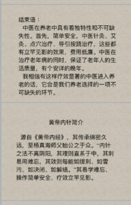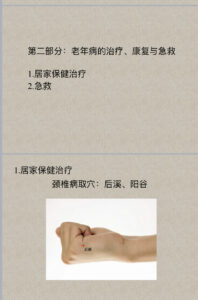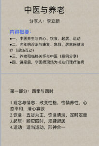 讲座从中医养生与养心、饮食、起居、运动;老年病诊治与康复、急救、居家保健治疗;养老和临终关怀与中医等三个大的方面进行讲解。深入浅出,内容丰富,生动风趣。