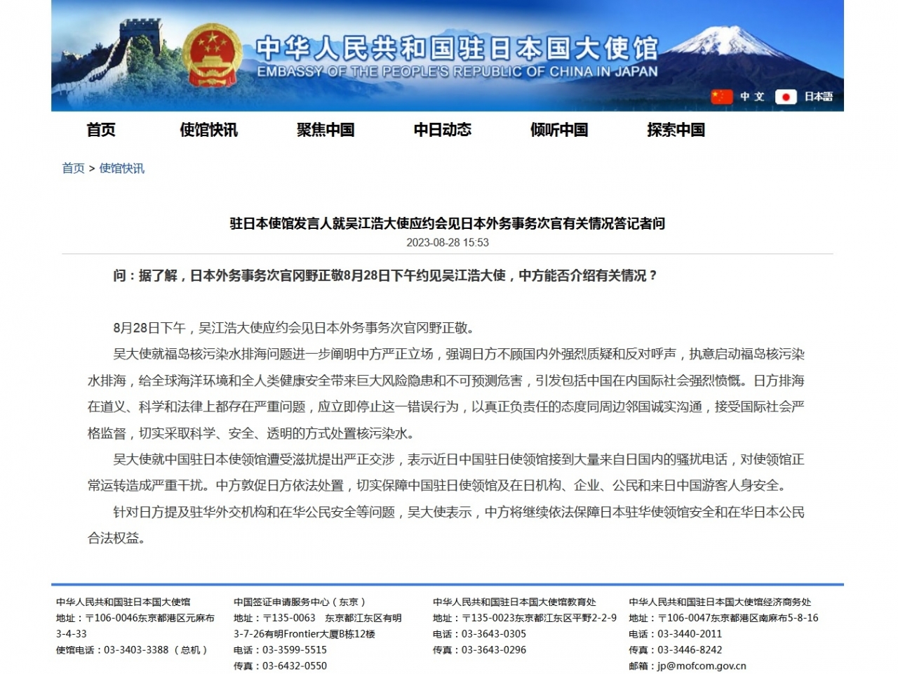 駐日本大使吳江浩應約與日本外務事務次官岡野正敬會面,就中國駐日本使領館遭受滋擾提出嚴正交涉。