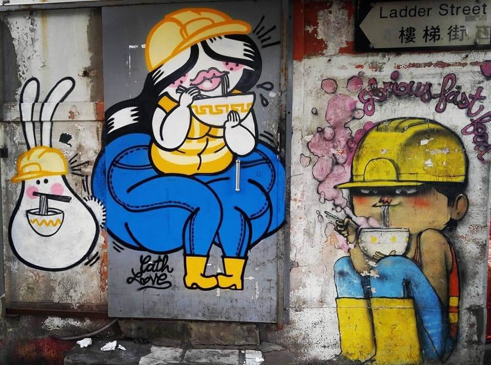 位於香港中上環的「輝煌快餐店」外牆,有一幅存在了10多年塗鴉,因畫中工人戴的是「黃帽」,被當局要求清除。(圖取自facebook.com/gloriousfastfoodhk)