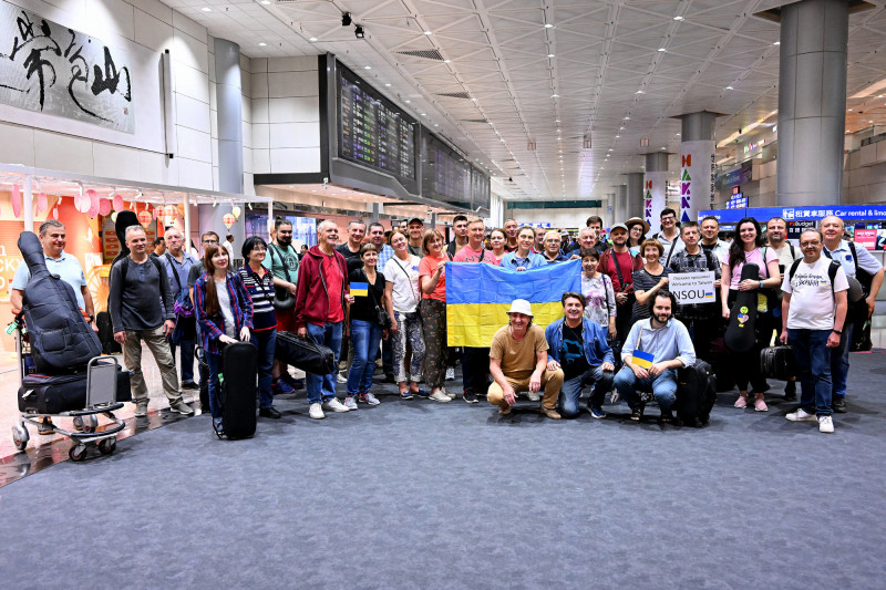 烏克蘭國家交響樂團今日下午,突破重重難關,終於抵達桃園國際機場,首度來台,團員們抵達桃園機場後舉起烏克蘭國旗一同合影並高喊:「我們在台灣」!