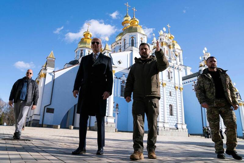 美國總統拜登(左)今年2月突訪烏克蘭首都基輔,和烏國總統澤倫斯基(右)走在基輔著名的聖米迦勒金頂修道院前。(法新社)