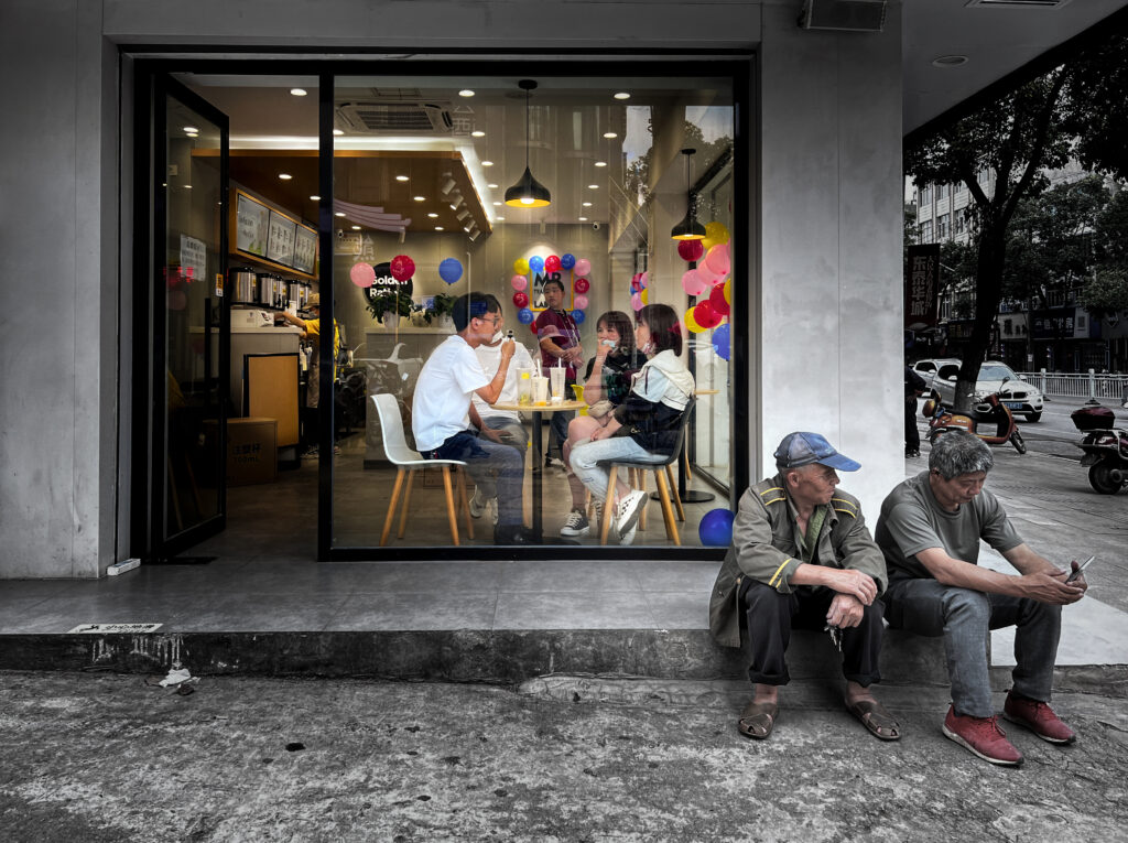 作品簡介:這張作品是2022年5月27日在湖北省黃梅縣城的一家店鋪門口拍攝的,當時店外兩位老者席地而坐,店內幾個年輕人正在品著奶茶。兩代人不同的生活方式、不同的消費觀念碰撞在一起,讓我忍不住拍下了這個畫面。現今的生活方式、消費觀念呈現出多元化,無論是錦衣玉食的精英族,還是粗茶布衣的勞力者,我們都有尊嚴地生活在一個平等、自由、包容的國度。