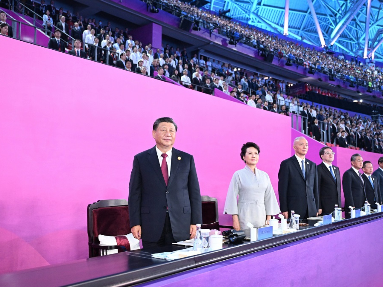 習近平中午在杭州的西子賓館舉行宴會,歡迎出席開幕儀式的國際貴賓並致辭時表示,自申辦以來,中國認真履行承諾,全力推進各項籌辦工作,願意與亞奧理事會和各國、各地區代表團共同努力,為世界呈現一屆中國特色、亞洲風采、精彩紛呈的體育盛會,為亞洲和國際奧林匹克運動發展作出新貢獻。