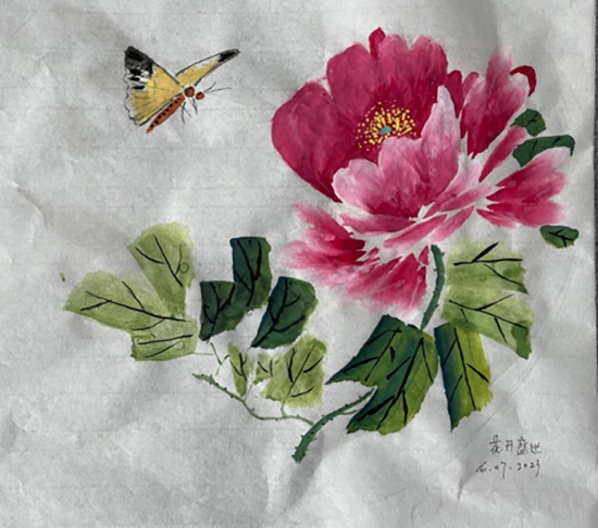 第一堂课,陈墨院长教画「梅花飞雪」,但我连毛笔都没有,但不想放弃。 找了一枝原珠笔,边学习边画。 第二堂课教用一只碗画「猫咪戏蝶」,我的工具到了,喜出望外。 成功画出了人生中的第一幅画,虽然我找的是一只大碗,这猫变的有点肥,但胖呼呼的却也可爱。 以后画葡萄、画玫瑰,我照着陈墨院长的讲课,依葫芦画瓢也画的像模像样。 家人和朋友都说画的不错,不像初学。 这自然增加了我学画的信心。
