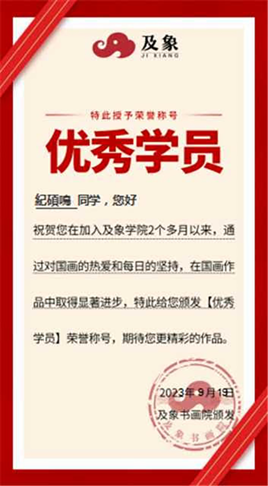 前几天,带班小夏老师给我发来了一张及象书画院颁发的优秀学员奖状。 这是我第二次得到绘画荣誉,上一次陈墨院长颁给我一张及象国画精品班最佳进步奖。