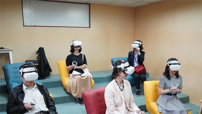 參訪期間,Prof.Elisabeth Gutjahr在影音互動展示區穿戴戲曲舞台服飾,體驗「粉墨登場」的舞台效果,更至VR體驗區實地觀賞三D戲曲表演影片的立體效果,對於館內展示的傳統戲曲舞台服飾、京劇臉譜、戲曲兵器、道具、樂器及戲曲源流演進及校史等內容,留下深刻的印象。之後來到京劇團排練現場,欣賞精彩的京劇傳統劇目《挑滑車》、及綜藝團將於《二○二三湖光山色藝術季》本月底秋季公演的《人身人聲人生》彩排。