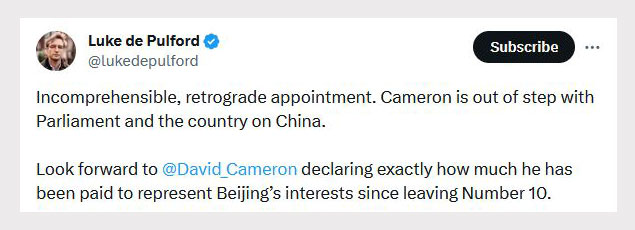 “對華政策跨國議會聯盟”執行董事裴倫德(Luke de Pulford)形容卡梅倫出任外相的決定“難以理解”,也是“倒行逆施”。