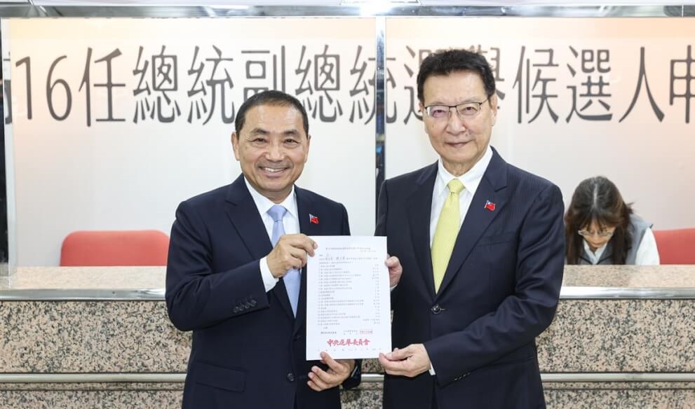 24日上午宣布副手搭檔為中廣董事長趙少康(前右),隨後一同前往中央選舉委員會登記參選,圖為2人展示登記完成的收據。.jpg)