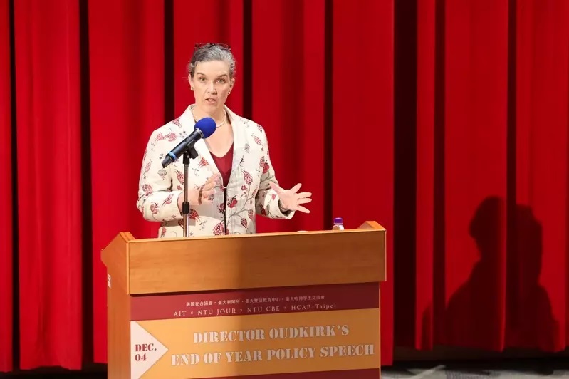 (中華新聞通訊社/中華時報12月5日訊)美國在台協會(AIT)處長孫曉雅(Sandra Oudkirk)4日應邀至台灣大學發表「年終政策演說」,聚焦網路攻擊(cyberattacks)及操弄網路資訊(online information manipulation)議題。她演講後接受台大副校長丁詩同代表聽眾提問,數位發展部長唐鳳等多位政商界人士出席。