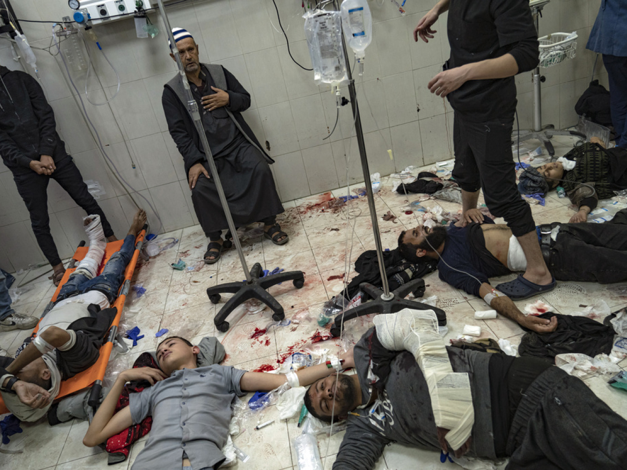 在醫院的走廊里,護理人員忙得不可開交。不知所措。在一個角落裡,一名醫生躺着一個穿着運動服的小男孩毫無生氣的屍體。在一個角落裡,一名醫生躺着一個穿着運動服的小男孩,他的雙臂交叉放在沾滿血跡的床單上。其他受傷的兒童正在地板上進行輸液。地上到處是用過的繃帶和乳膠手套。