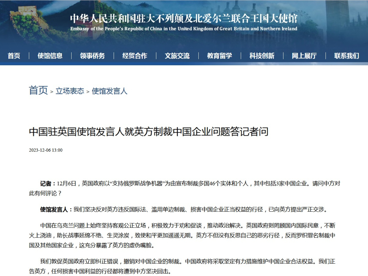 (中華新聞通訊社/中華時報12月7日訊)英國政府以「支持俄羅斯戰爭機器」為由,宣布制裁多國46個實體及個人,其中包括三家中國企業,以打擊對俄軍事供應鏈。這是英國首次制裁中國企業,中國駐英大使館敦促英國政府立即糾正錯誤,聲言會對損害中國利益的行徑作出回擊。