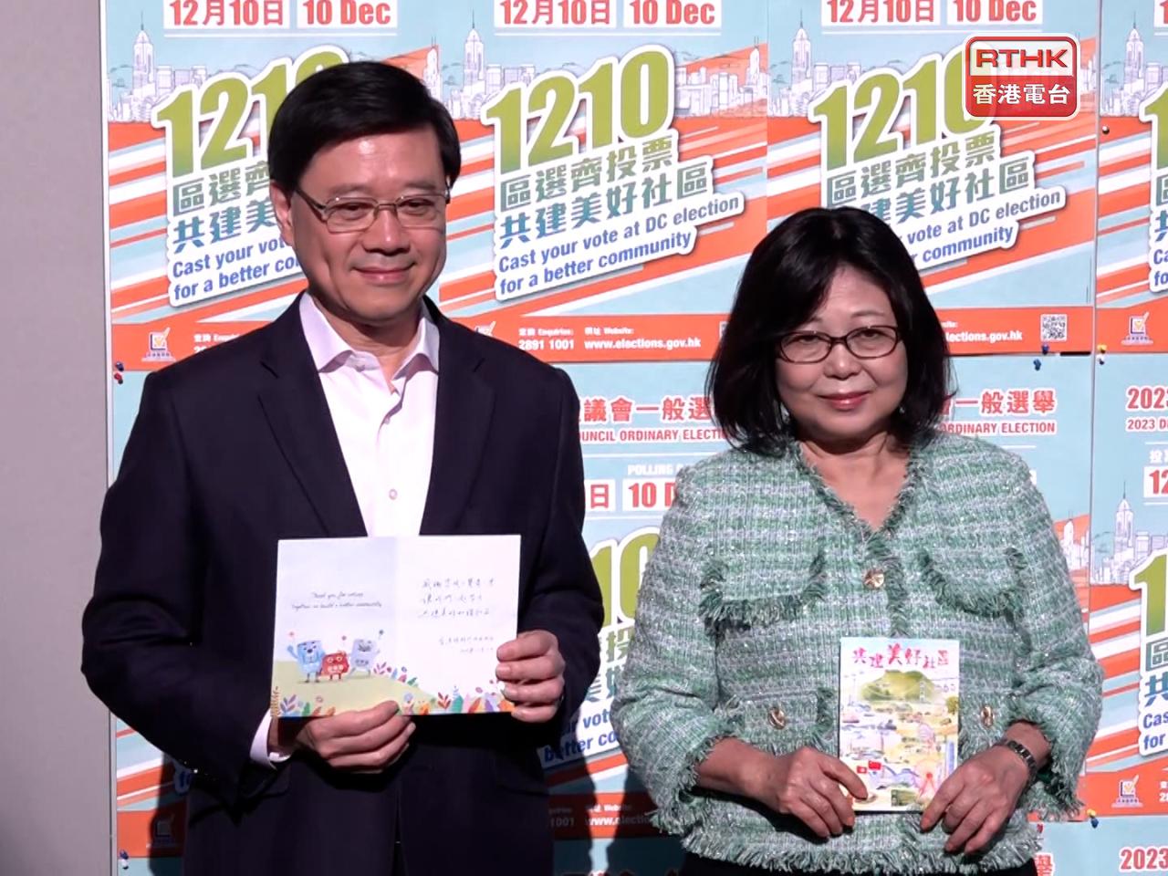 (中華新聞通訊社/中華時報12月9日訊)區議會選舉今日舉行,區議會選舉今日舉行。區議會選舉今日舉行,行政長官李家超與太太林麗嬋早上約9時許到中區高主教書院的投票站投票。