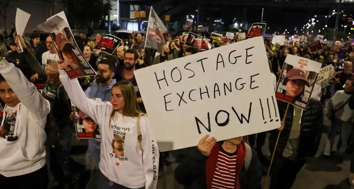 周五晚上,在以色列軍隊誤殺人質事件公之於眾後不久,數百人在特拉維夫走上街頭進行抗議。從電視新聞畫面可以看到,示威人群在市中心集合,封住了主要街道。人們要求政府為立即解救所有人質做出努力。他們手舉標語和印著人質頭像和姓名的海報,一路行進至以色列國防軍總部大樓前。