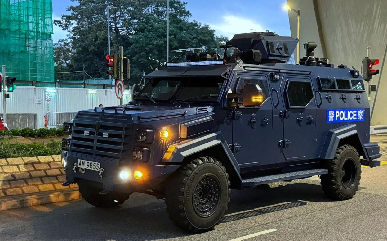 法院外加強保安,反恐特勤隊、裝甲車在以及警車在法院外戒備。
