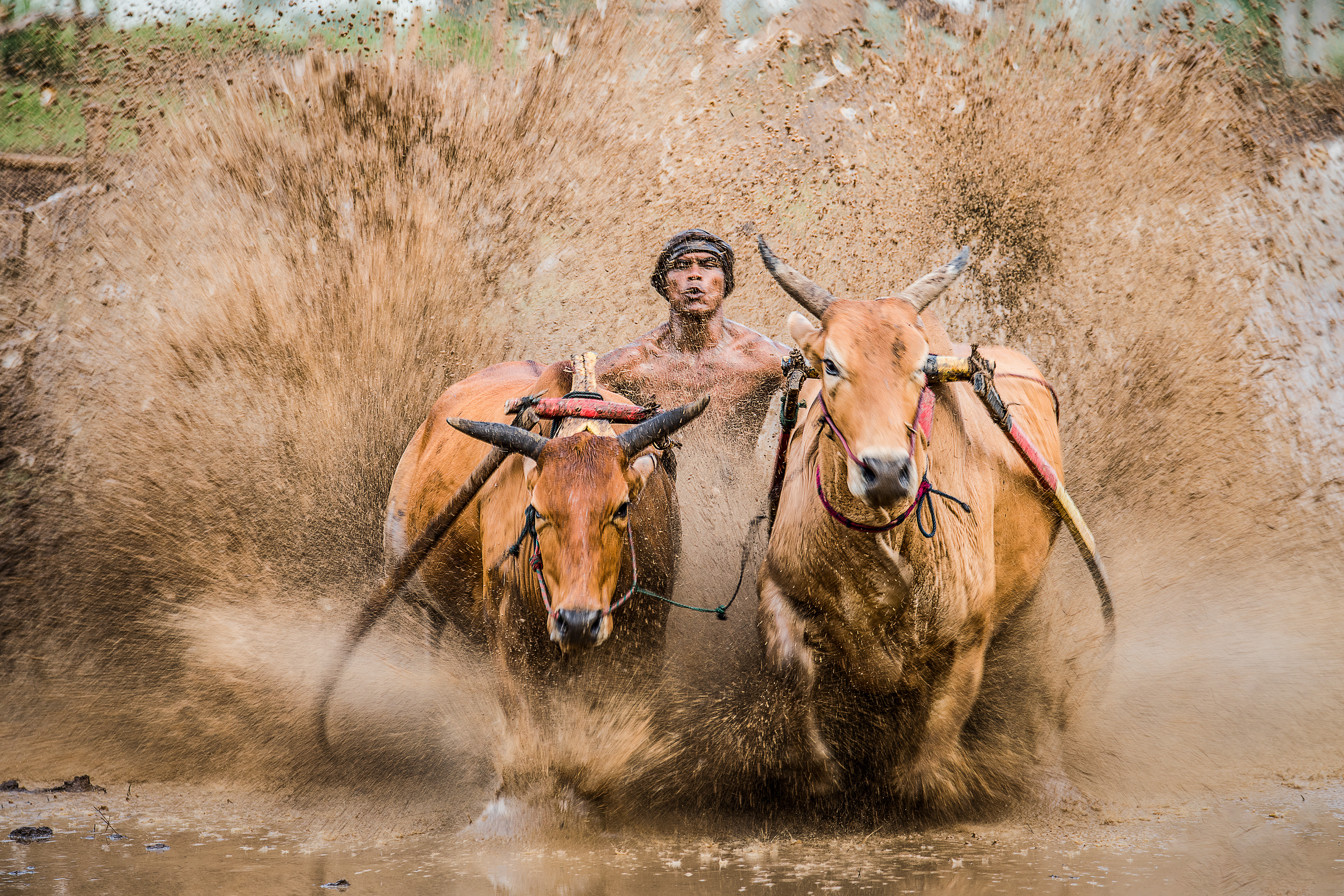 作品简介:两年前摄于印度尼西亚苏门答腊岛的一个小村庄,当时刚好遇到当地的传统赛牛活动,看到骑士在两头牛身后的中间位置,踩在木犁上,然后两手抓住牛尾巴进行操控,双牛并行,泥浆四溅,颇为壮观,心情非常激动,赶紧把相机调到高速连拍,捕捉精彩瞬间。