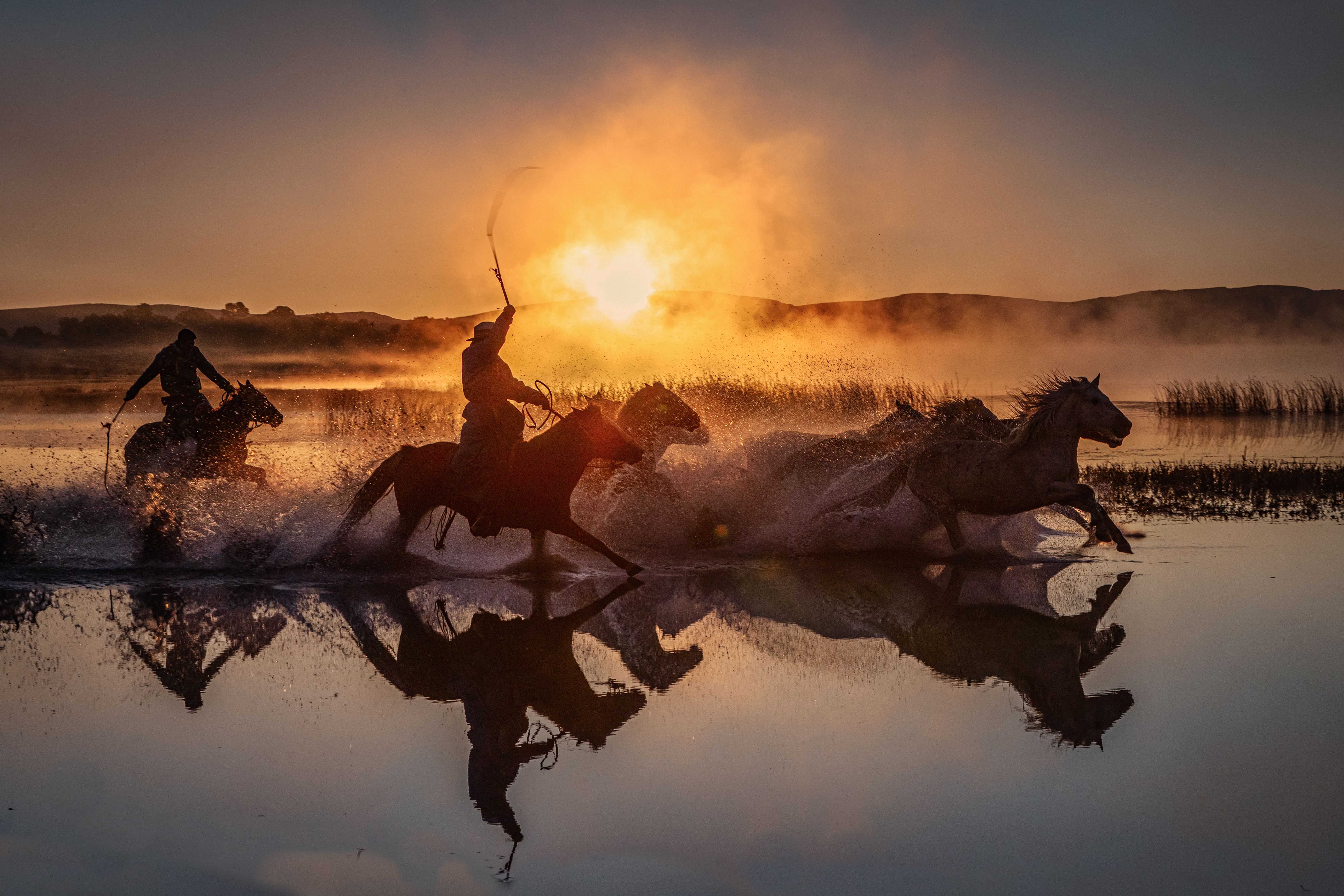 作品簡介:拍攝於內蒙古壩上草原,金秋的壩上早晨,陽光灑滿廣袤的草原,英俊的蒙古漢子揚鞭策馬,奔馳在將軍泡子,水花四濺。畫面美輪美奐。