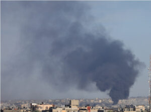 1月13日,加沙地带南部城市汗尤尼斯遭以色列空袭后升起浓烟。新华社发(亚西尔·库迪摄)