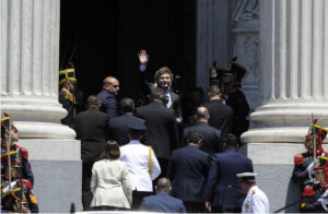 2023年12月10日,在阿根廷布宜诺斯艾利斯的国会广场,阿根廷新总统米莱在就职仪式前向民众致意。新华社发(哈维尔·冈萨雷斯摄)