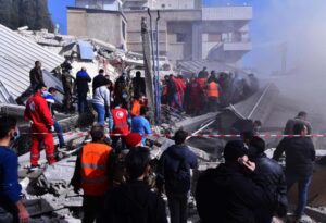 叙安全人员已部署至遇袭建筑周边。现场可看到救护车和消防车,救援人员在搜寻瓦砾下的幸存者。附近一些建筑和车辆的玻璃碎裂。