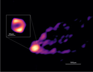这是人类首张黑洞照片“主角”M87黑洞的阴影、吸积流和喷流一起成像的全景图(中国科学院上海天文台供图)。新华社记者张建松摄