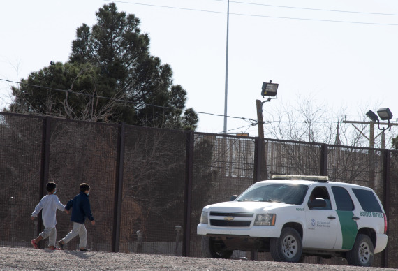 这张2021年3月27日在墨西哥华雷斯拍摄的照片显示,两名来自危地马拉的移民儿童在跨越美墨边境的里奥格兰德河后,遇到美国边境巡逻队的执法车辆。新华社发(戴维·佩纳多 摄)