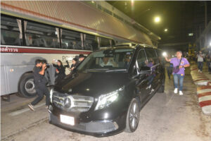 2月18日清晨,在泰国曼谷的泰国警察医院,在此治疗和服刑的他信乘车离开。新华社发(拉亨摄)