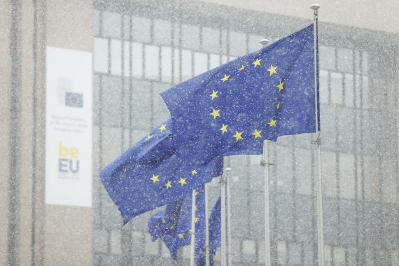 图为2024年1月17日,在比利时布鲁塞尔,欧盟旗帜在雪中飘扬。新华社记者赵丁喆摄