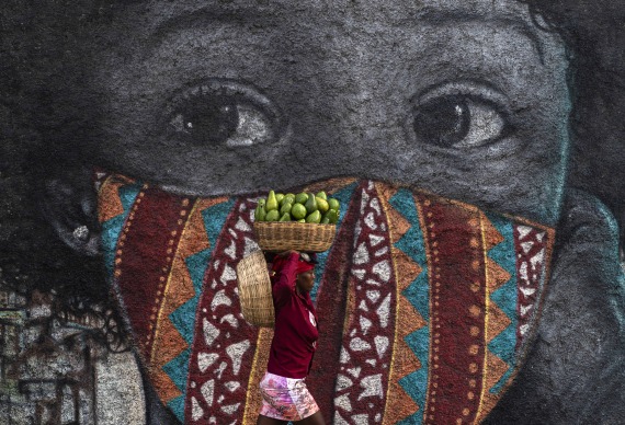 2021年8月24日,一名女子头顶水果走在海地太子港街头。新华社发(戴维·德拉帕斯摄)