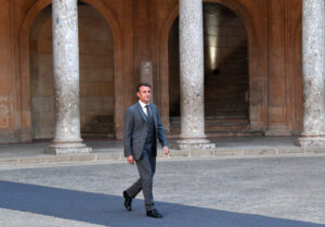 2023年10月5日,在西班牙格拉纳达,前来参加第三届欧洲政治共同体领导人会议的法国总统马克龙抵达阿尔罕布拉宫。新华社记者连漪摄