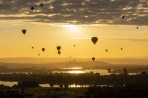 3月9日,在澳大利亚堪培拉,热气球飞过伯利·格里芬湖上空。新华社发(储晨摄)