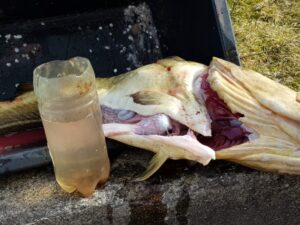 这是2018年4月6日在挪威西部城市卑尔根以南约100公里的穆斯特岛拍摄的鳕鱼和从它腹中取出的塑料瓶。新华社发(比约恩·英瓦尔森摄)