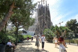 游客在西班牙巴塞罗那圣家堂附近游览(2021年6月27日摄)。新华社记者张铖摄