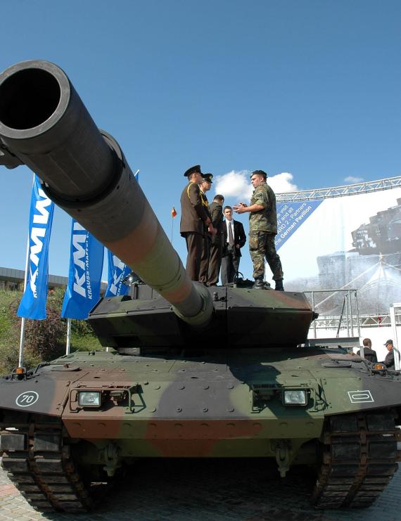 2005年9月27日,在土耳其首都安卡拉举办的第7届国际防务工业展上,一名德国士兵(右一)站在“豹2”型主战坦克上对参观者进行讲解。新华社记者王健摄