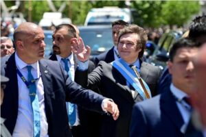 2023年12月10日,在阿根廷首都布宜诺斯艾利斯,阿根廷新总统米莱(中右)在前往总统府玫瑰宫路上向民众致意。新华社发(赫尔曼·阿德拉斯蒂摄)