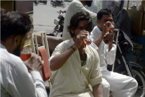 5月21日,在巴基斯坦南部信德省首府卡拉奇,人们在街头饮水消暑。新华社发