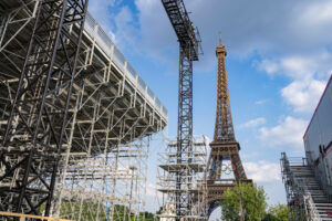 记者在现场看到,广场上铺设了专用地板,三面搭建起大屏幕悬挂台以及临时坐席台,这些坐席将提供给媒体、奥林匹克大家庭成员以及受邀观看仪式的嘉宾。勒德鲁说,虽然赛会很快就要开幕,但工程目前仅完成了70%,还有一些小型基础设施比如配电、网络系统还在紧张安装中。