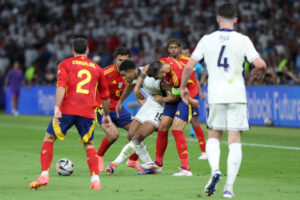 7月14日,西班牙队球员罗德里(左二)、莫拉塔(右二)在比赛中防守英格兰队球员贝林厄姆(左三)。 新华社记者 潘昱龙 摄