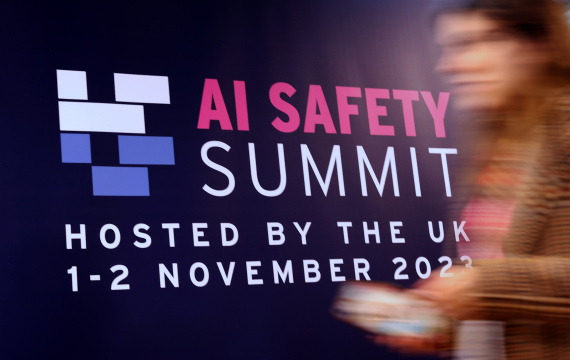 图为2023年11月2日,在英国布莱奇利园,一名参会者经过首届人工智能安全峰会的宣传展板。(新华社记者李颖摄)