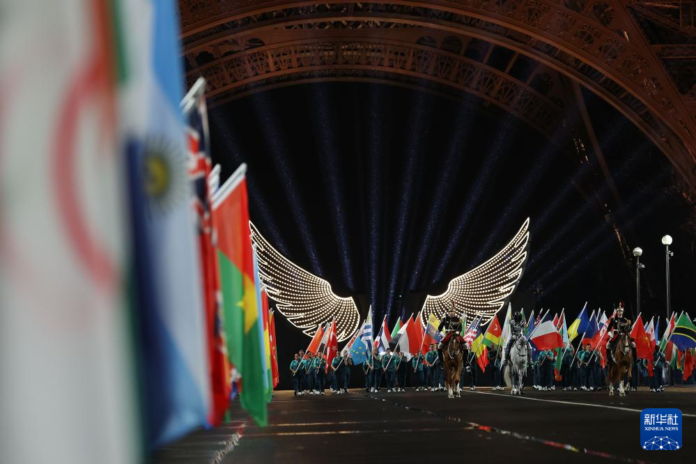 塞纳河上,身披奥运五环斗篷的女骑士骑金属马踏水而来。她穿过耶拿桥,到达特罗卡德罗广场,邀请全世界一起捍卫卓越、尊重、友谊的奥林匹克价值观。她经过时,桥梁上的灯光形成了和平鸽的翅膀。各代表团的旗帜在特罗卡德罗广场和埃菲尔铁塔之间行进,铁塔下亦出现一对巨大翅膀,女骑手和白马从水中登陆铁塔下。
