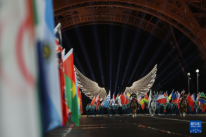 法国次女高音歌唱家身穿与法国国旗同色的裙子,在巴黎大皇宫屋顶演唱了充满力量感的法国国歌《马赛曲》。《马赛曲》响起,法国国旗也在特罗卡德罗宫升起。聚光灯照射在塞纳河上缓缓升起的10位创造法国历史的女性雕像上,这些女性有作家、运动员、律师、哲学家、记者、植物学家、教师、诗人、导演、法官,表演传达出法国对历史上这些女性的敬意。