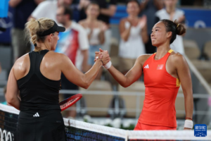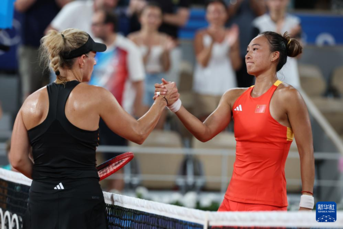 7月31日,郑钦文(右)和科贝尔在赛后握手致意。新华社记者 高静 摄
