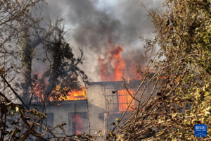 新华社驻雅典的摄影记者和视频记者分别从前方发回大火现场的画面。画面中可以看到山林中被烧毁的房屋、在道路上燃烧的汽车,以及当地居民的伤心和无奈。