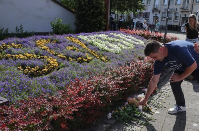 8月24日,在德国西部北莱茵-威斯特法伦州索林根市,一名男子在案发现场附近摆放蜡烛悼念遇难者。(新华社记者张帆摄)