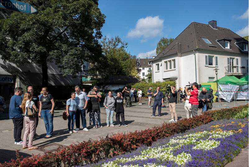 8月24日,在德国西部北莱茵-威斯特法伦州索林根市,哀悼遇难者的民众和媒体工作者聚集在案发现场附近。(新华社记者张帆摄)