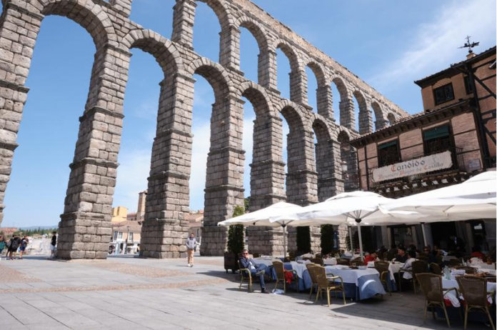 这是2023年5月17日在西班牙塞哥维亚拍摄的古罗马高架引水渠脚下的“坎迪多”餐馆。新华社记者孟鼎博摄
